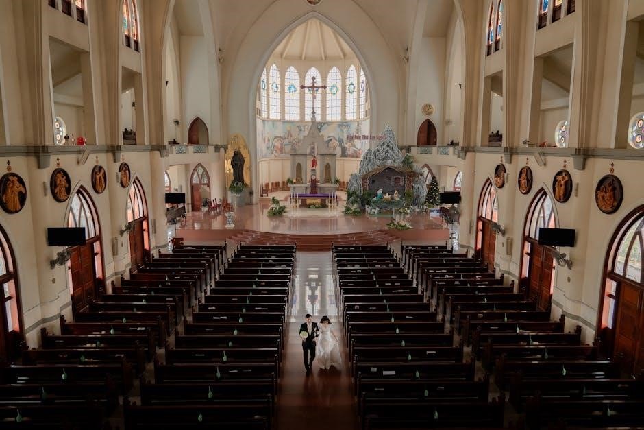 Music in a Catholic wedding must reflect the sacredness of the sacrament. Choices should align with liturgical guidelines, ensuring songs are appropriate for worship. The responsorial psalm and Gospel acclamation are key moments, often featuring traditional hymns like the Celtic Alleluia. Approval from church authorities is essential to maintain reverence and liturgical integrity.