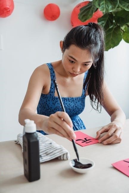 Mastering calligraphy techniques requires dedication and precision‚ focusing on stroke order‚ balance‚ and aesthetic appeal. Chinese calligraphy is an art form that enhances character writing skills. Using specialized tools like brushes or fountain pens can improve stroke control. Rice grid paper is highly recommended for precision‚ as it provides a structured layout to practice intricate strokes. Advanced learners often use books purchased on Amazon‚ such as those designed for calligraphy practice‚ which offer guided exercises. Additionally‚ digital tools like Purple Culture allow users to create custom worksheets‚ focusing on specific characters or styles. Consistent practice with these resources helps refine technique‚ making calligraphy a rewarding extension of Chinese writing practice. Regular review and feedback are essential for mastering this traditional art form.