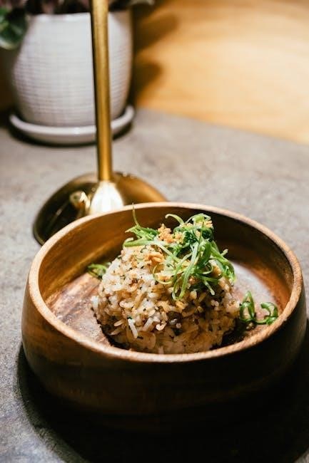 The Decor Rice Cooker Instructions PDF emphasizes the importance of using the correct rice-to-water ratio for optimal results. For white long grain rice‚ a 1:2 ratio is recommended‚ ensuring fluffy and perfectly cooked grains. Using the provided measuring cup guarantees accuracy‚ while the cooker’s design maintains the ideal consistency. Adjustments may be needed for specialty rices like brown or wild rice‚ as specified in the guide. Proper measurement is key to avoiding undercooked or mushy textures‚ making the rice-to-water ratio a foundational step in achieving culinary success with the Decor Microsafe 2.75L Rice Cooker.