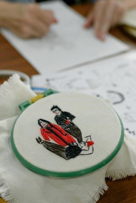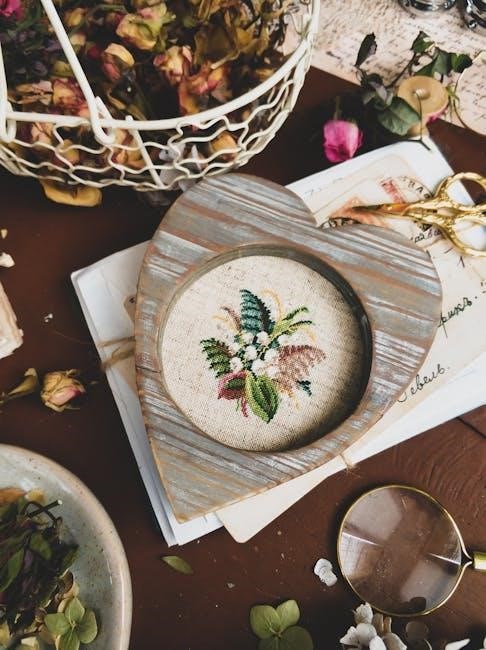 The cross-stitch is a popular decorative stitch, often used in patterns and designs. It involves creating an “X” shape on fabric, making it ideal for beginners. The herringbone stitch, on the other hand, is a reversible stitch with a chevron-like appearance, perfect for borders and stripes. Both stitches are versatile and widely used in embroidery projects. PDF guides provide detailed step-by-step instructions, including illustrations, to help embroiderers master these stitches. Cross-stitch is great for creating bold designs, while the herringbone stitch adds a subtle yet elegant texture. These stitches are essential for any embroiderer looking to enhance their skills and create beautiful, intricate designs.