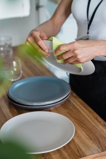 Proper loading ensures optimal cleaning and prevents damage. Place large items like plates and bowls at the bottom, facing the center. Utensils go in designated baskets, with sharp objects secured. Glasses and smaller items belong on the upper rack, spaced evenly. Avoid overcrowding and blocking water jets. Face dirty surfaces toward the center for thorough cleaning. This arrangement maximizes efficiency and protects your dishes.