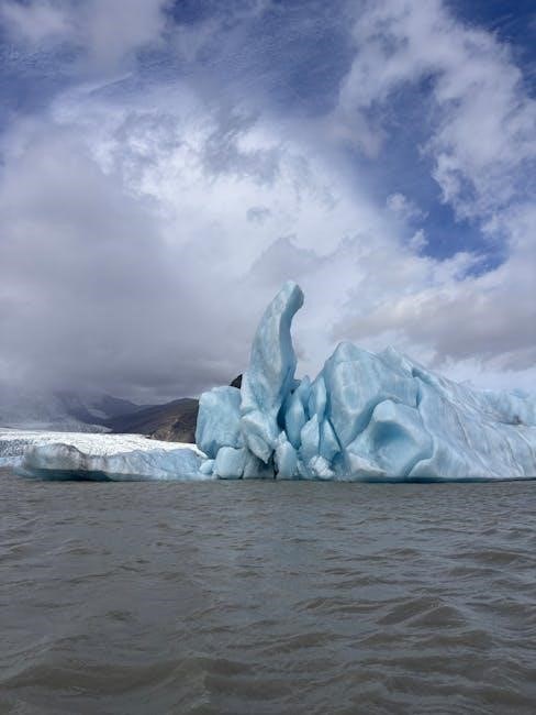 Icebergs float because they are less dense than seawater. Ice, which is freshwater, is less dense than saltwater, allowing it to remain buoyant. When ice forms on land or in polar regions, it eventually breaks off into the ocean as icebergs. These massive chunks of ice displace water, but since ice is less dense, only a small portion of the iceberg is visible above the water surface, while the majority remains submerged. This phenomenon is explained by Archimedes’ principle, which states that the buoyant force of an object is equal to the weight of the water it displaces. Icebergs also contain air pockets, further reducing their overall density and enhancing their ability to float. The unique composition of icebergs ensures they remain afloat, playing a crucial role in ocean dynamics and ecosystems. Understanding why icebergs float is essential for grasping their behavior and the impacts of their melting on global sea levels and marine life.