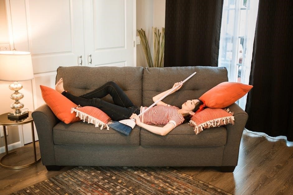 Manual reclining sofas require periodic maintenance to ensure smooth operation. Regularly inspect and clean the reclining mechanisms, removing dust or debris. Lubricate hinges and moving parts with silicone-based sprays to maintain functionality. Avoid using household oils, as they may damage materials. For leather models, condition the upholstery to prevent cracking. Proper adjustment and lubrication extend the sofa’s lifespan and ensure optimal performance over time.